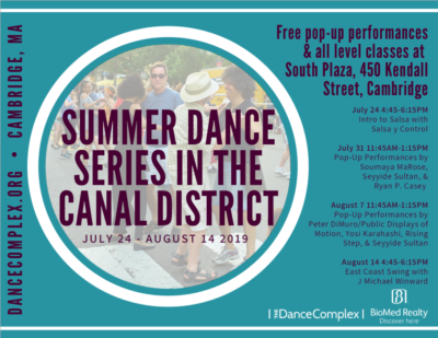 The Dance Complex is popping up around town this July and August with opportunities for FREE dance classes and performances for the community. These events will celebrate the wonder and curiosity of dance for all in accessible settings for our community at large. Through partnerships with the Cambridge Public Library and BioMed Realty, The Dance … Continued