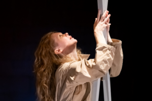 Photo of performer in all white looking up holding on to fabric hanging from above