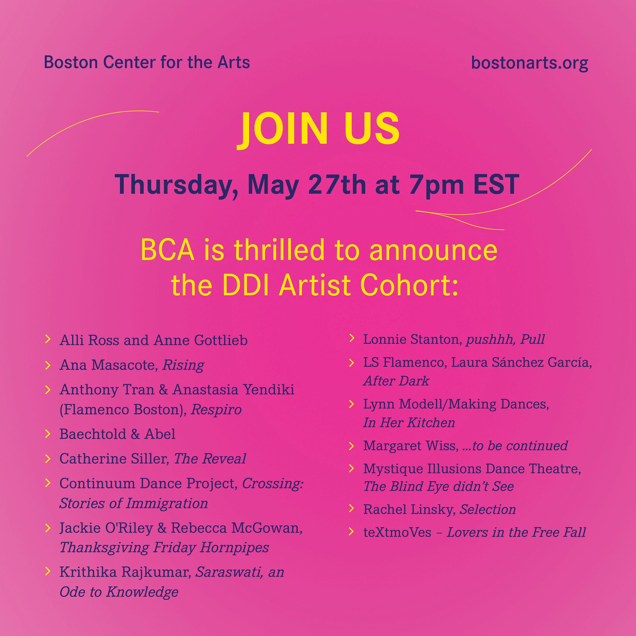 Boston Center for the Arts’ Dance Documentation in Isolation (DDI) artists share work for the camera made during the pandemic year on Thursday, May 27 at 7 PM. Watch the films and share your impressions with a cadre of talented local artists.