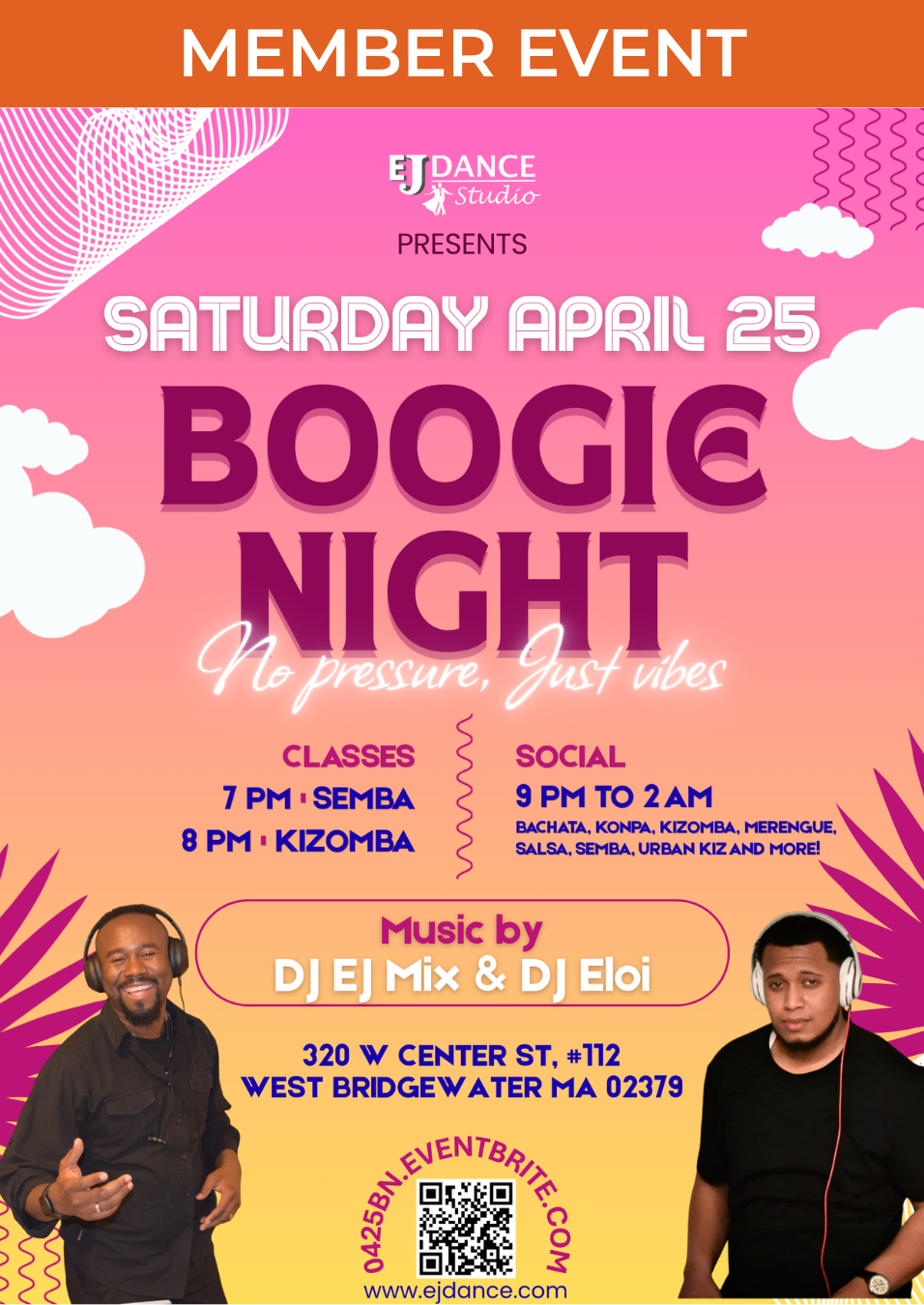 Kick off your night with good energy and zero stress! Whether you’re a beginner or just looking for a fun night out, Boogie Night is all about enjoying the music, learning a little, and dancing your heart out 💃🕺 Schedule: * 7:00 PM – Semba Class: Easy, fun, and beginner-friendly! Learn the basics and get … Continued