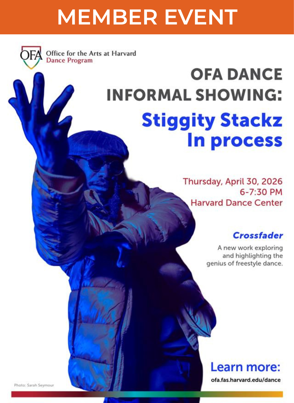 OFA Dance Program’s Spring 2026 Artist-in-Residence Stiggity Stackz will share excerpts of his work-in-progress titled “Crossfader.” Crossfader invites viewers into the world of freestyle dance in an accessible, engaging way, highlighting both its cultural roots and its innovative potential on stage. This informal showing includes a Q&A discussion facilitated by Dr. Marius Kothor, Assistant Professor … Continued
