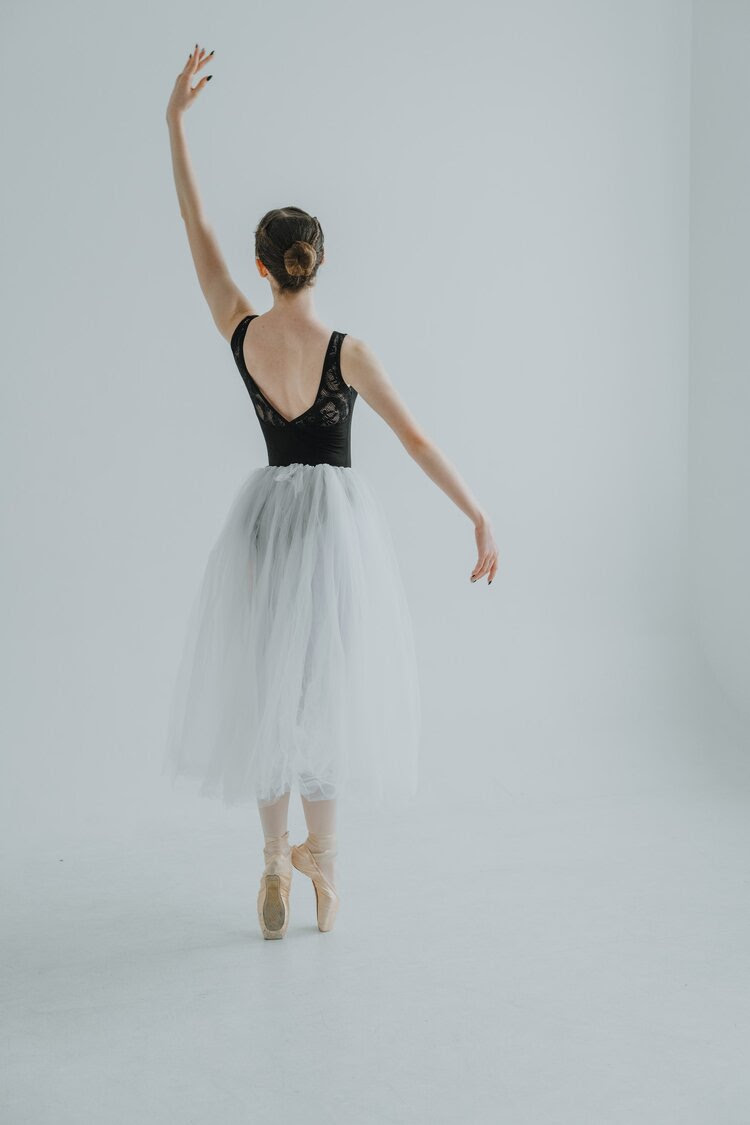 Ballet dancer on pointe, in a black leotard and a long white tutu faces the back and lifts one arm up while elongating the other down.