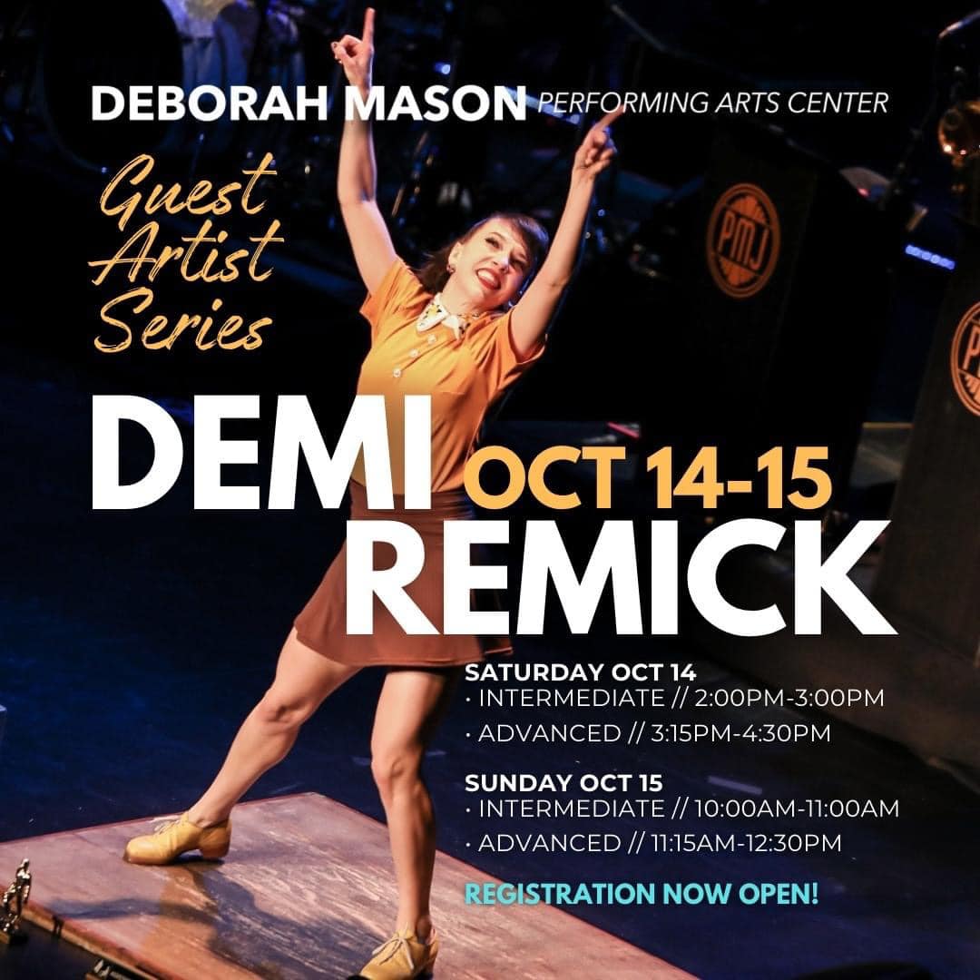 Photo of Demi Remick extending one leg to the side and reaching arms up on opposite diagonal.