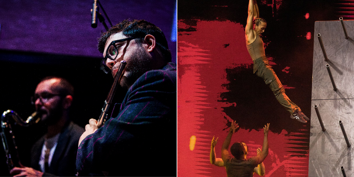 Two photos side by side: on the left two musicians play wind instruments; on the right two acrobats perform, one hanging from a high place and the other below ready for a catch.