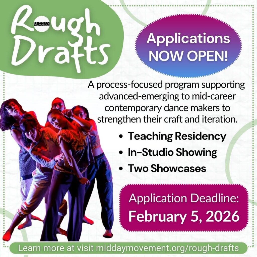 Rough Drafts is a choreographic development lab and teaching residency in support of the development of new and reimagined work for Massachusetts based movement artists. Produced by Midday Movement Series (“MIDDAY”), Rough Drafts values iterative creative processes, with a focus on bolstering potential for success and career longevity, especially for BIPOC, low-income, and other marginalized artists. With local funding often prioritizing new and/or finalized work, and with rising costs of living and artistic resources, dance artists are often pushed to focus on product, letting incubation fall by the wayside. Long-term, this pattern shrinks and homogenizes our local field, depriving us of cultural and creative diversity, not to mention equity.