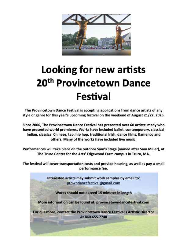 The Provincetown Dance Festival is accepting applications from dance artists of any style or genre for this year’s upcoming festival on the weekend of August 21 and 22, 2026.