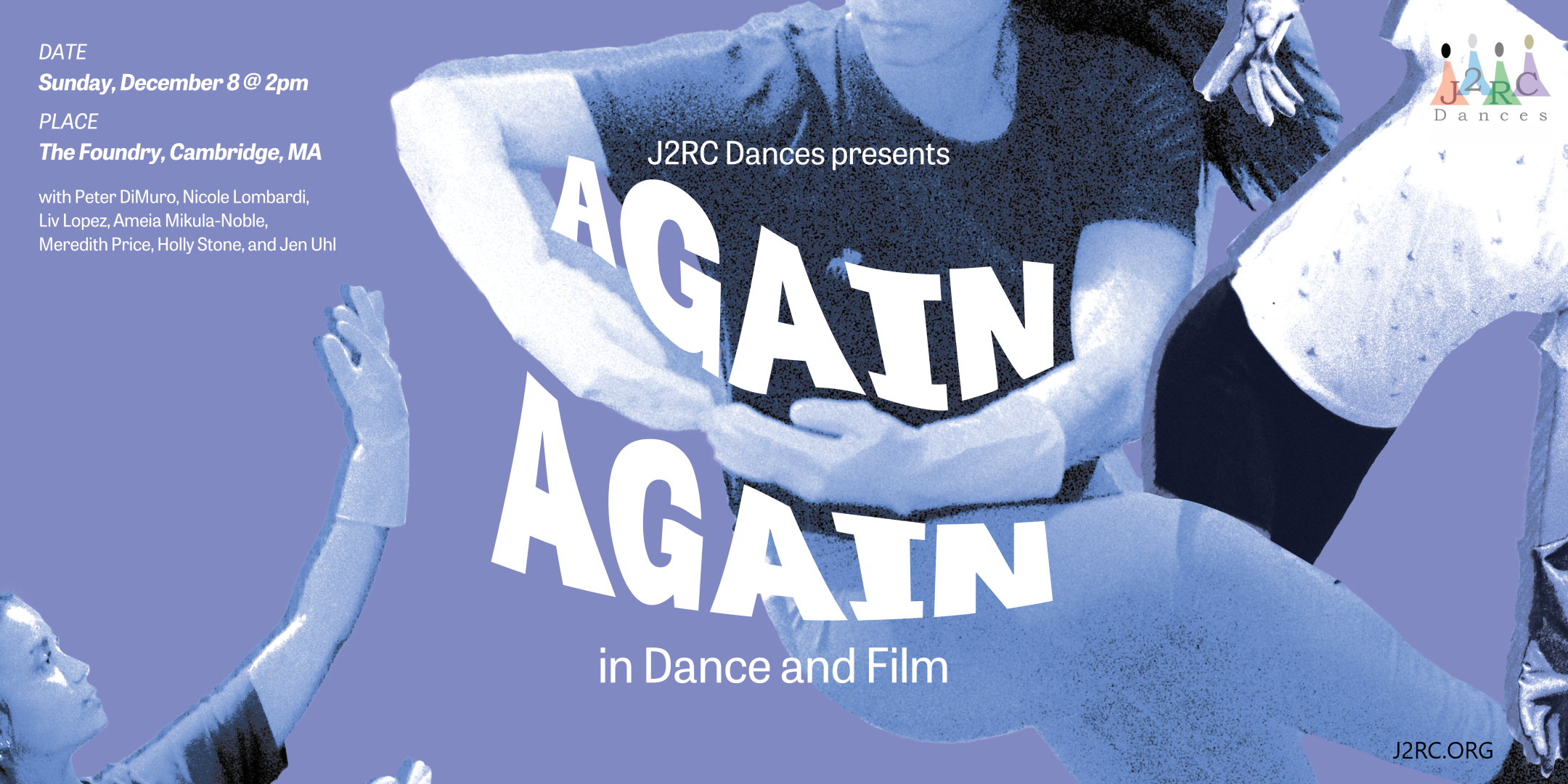 AGAIN AGAIN in Dance and Film, presented by J2RC Dances, includes modern dance and film works from artists Peter DiMuro / Public Displays of Motion, Nicole Lombardi, Liv Lopez, Ameia Mikula-Noble, Meredith Price, Holly Stone and Artistic Director Jen Uhl. It offers a variety of artistic works broadly related to the concept of repetition. This sense of repetition embodies itself via time passing (sometimes several decades), variations unfolding, unfinished projects reemerging and discovery of new revelations from revisiting past work again – and again. This performance results from the creative work of seven artists collaborating and documenting work this fall. AGAIN AGAIN incorporates modern choreographers, modern dancers and videographers from a wide array of perspectives including the LGBTQIA+ lens. Peter DiMuro / Public Displays of Motion presents the short film “The House of Accumulated Beauties” from his year as choreographer-in-residence at the Isabella Stewart Gardner Museum.