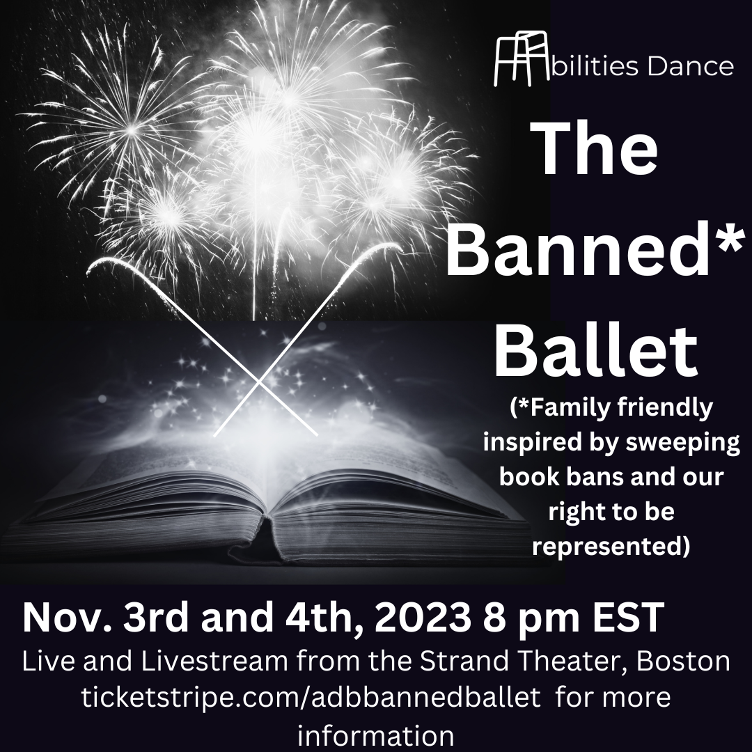 Black poster with white image of open book with fireworks coming out. Event information displayed in white on the right side and bottom.