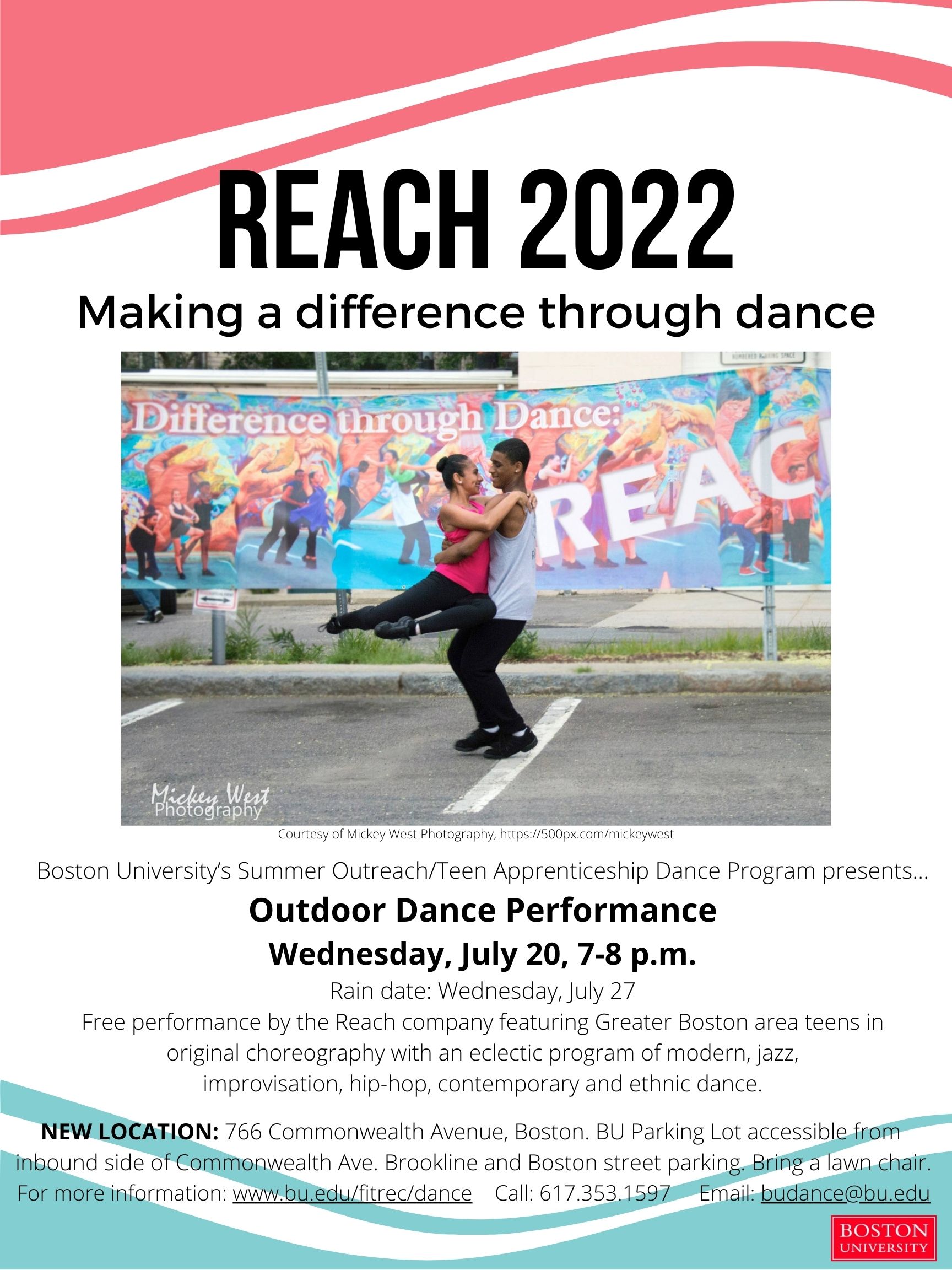 Reach’s free performance will be held on the BU campus in the 766 Commonwealth Ave. parking lot on Wednesday, July 27, 7-8pm (originally July, 20). This summer, Reach: Summer Outreach Dance/Teen Apprenticeship Dance Program returns to meeting in-person and celebrates its 32nd anniversary! Since 1990, Reach has been providing training and mentorship to teen apprentices and bringing dance performances and workshops to Greater Boston neighborhood centers and 1,000 children. This is their only public performance. Three pieces of Dance Collective repertory, one each by co-founders, Martha Armstrong Gray and Dawn Kramer, as well as, one by Judith Chaffee, long-time artistic director, have been modified and included in the program along with new works created by the company. The pieces reflect the diversity of the participants, with Hip Hop, Step, modern, contemporary, jazz, and ballet represented. Bring a lawn chair or blanket.