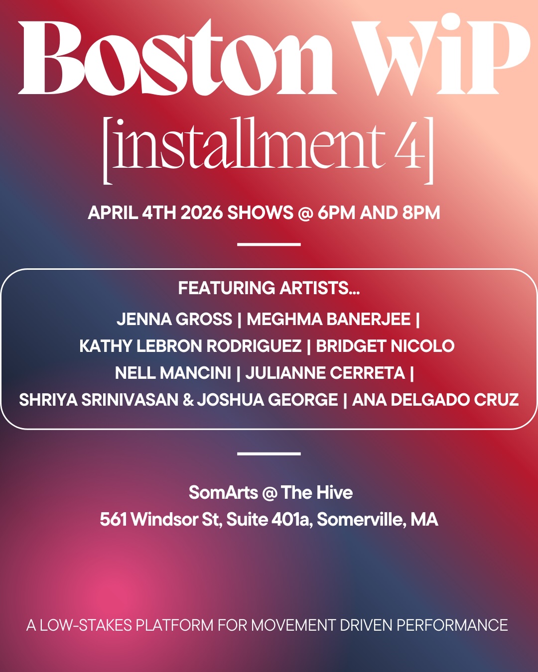 Boston WiP is a low stakes platform for choreographers to present movement driven work. This year we are excited to present Kathy Lebron Rodriguez (Komadre Kathy), Nell Mancini, Meghma Banerjee, Julianne Cerreta, Bridget Nicolo, Jenna Gross, Shriya Srinivasan & Joshua George, and Ana Delgado Cruz.