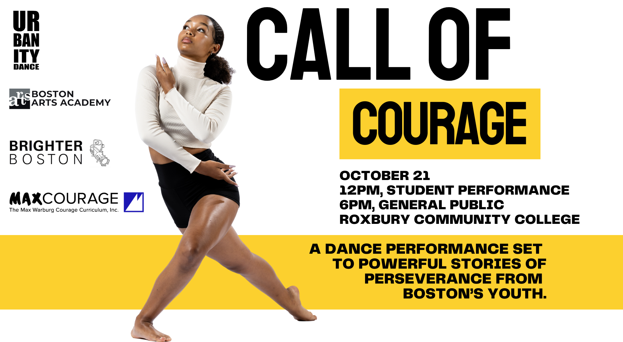 Call of Courage, a performance that features choreography set to powerful stories of perseverance from Boston’s youth, is back! Students and teachers can join us for a free 12pm showing while the general public can purchase tickets for the 6pm showing.