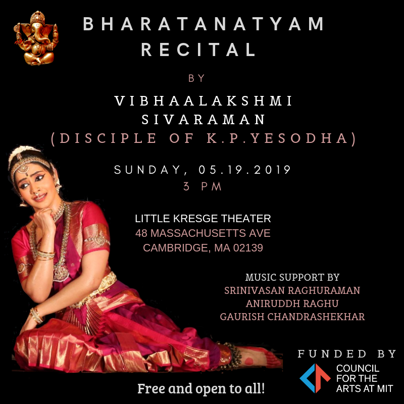 Come spend your Sunday afternoon with a classical Indian dance performance by Vibhaa Sivaraman. The performance will be in bharatanatyam style, with a series of independent pieces. All pieces will be preceded by narrations and prose descriptions to aid understanding of the art.