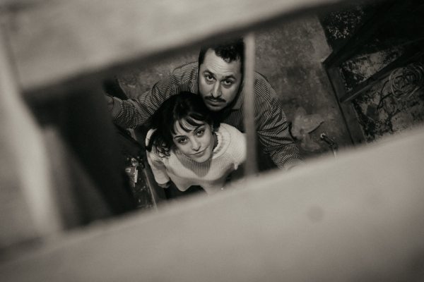 One white female with long brown hair and bangs stands looking up at the camera while wearing a white turtleneck sweater. A white man with short dark hair stands behind her, with arms outstretched, wearing a checkered long sleeve button down shirt. The pair is framed by wooden floor boards, as the camera points down at them from an attic space.