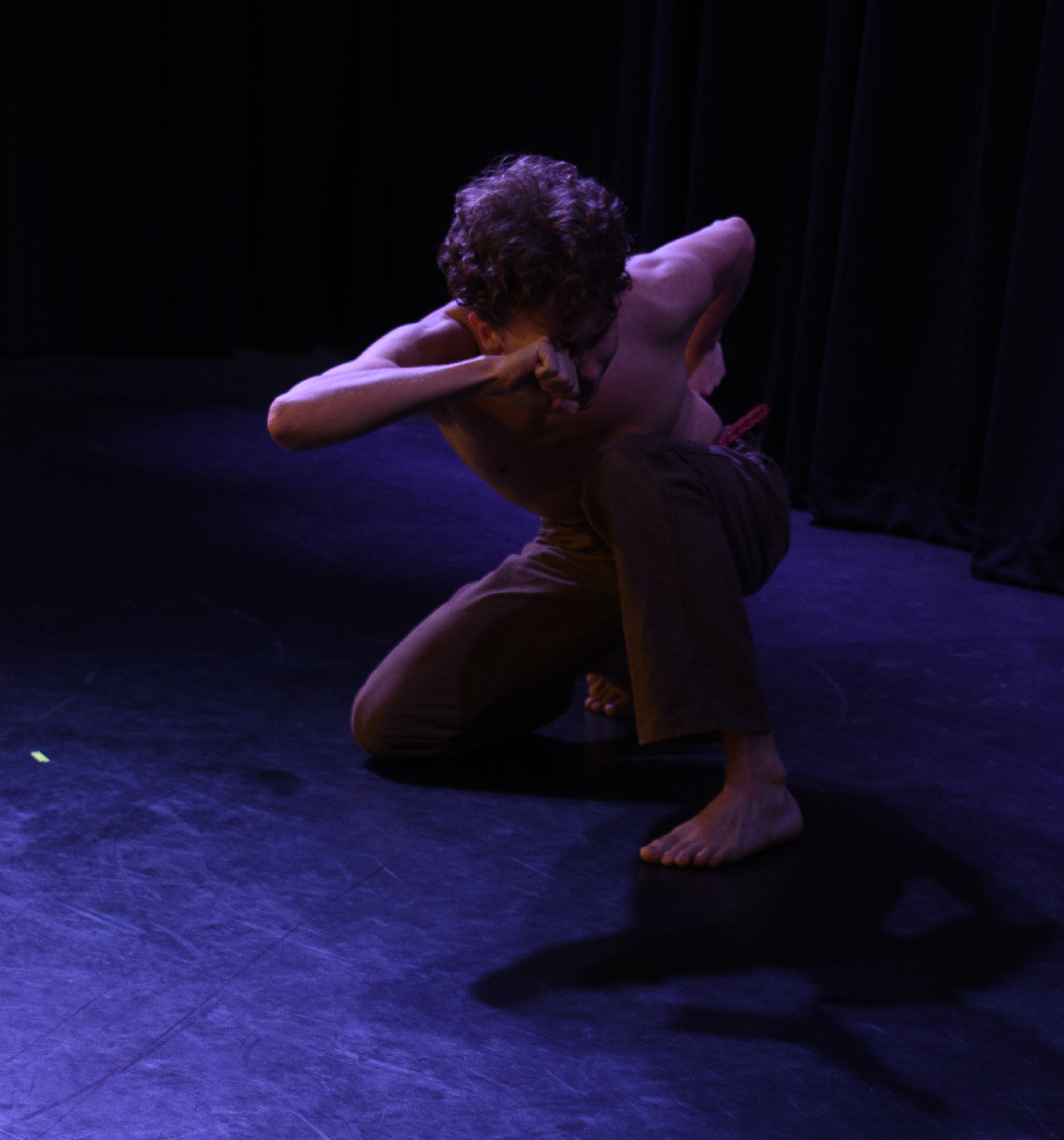 Dark photo of Myles Kercher on stage crouched down in a twisted position