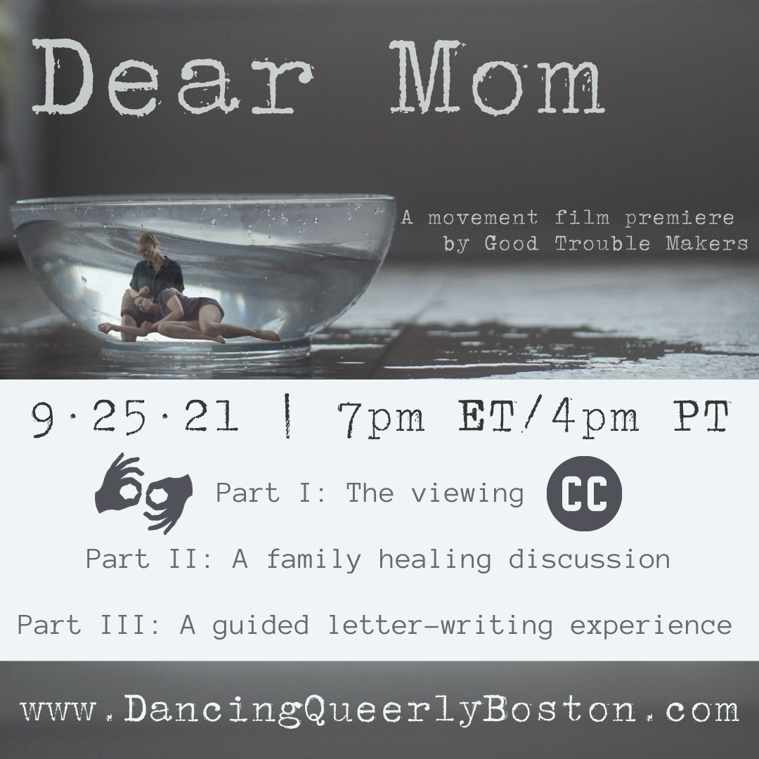 In honor of Bi Pride Month this September, Dancing Queerly presents Dear Mom: a tender and vulnerable hour-and-a-half experience exploring *bi+/queer families of origin by Good Trouble Makers. Through film, discussion, and a guided letter-writing experience we’ll explore the landscape of the pain, healing, and joy that’s possible at our roots. If you are a person who experiences multi-gender attraction, this event was made for you! If you are the family, be it chosen or family of origin, of a person who is *bi+\queer and you want to understand them better, welcome! If you want to join Good Trouble Makers for the world premiere of Dear Mom and this meaningful multifaceted experience, see you there!