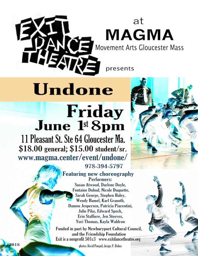 Exit Dance Theatre present UNDONE Presented by Exit Dance Theatre WHERE MAGMA - Movement Arts Gloucester Mass 11 Pleasant St. Suite 64 , Gloucester WHEN The dates for this event have passed COST $18 General/$15 Student, Sr. An evening of six new works ~ Modern Dance Performances Ticket Information