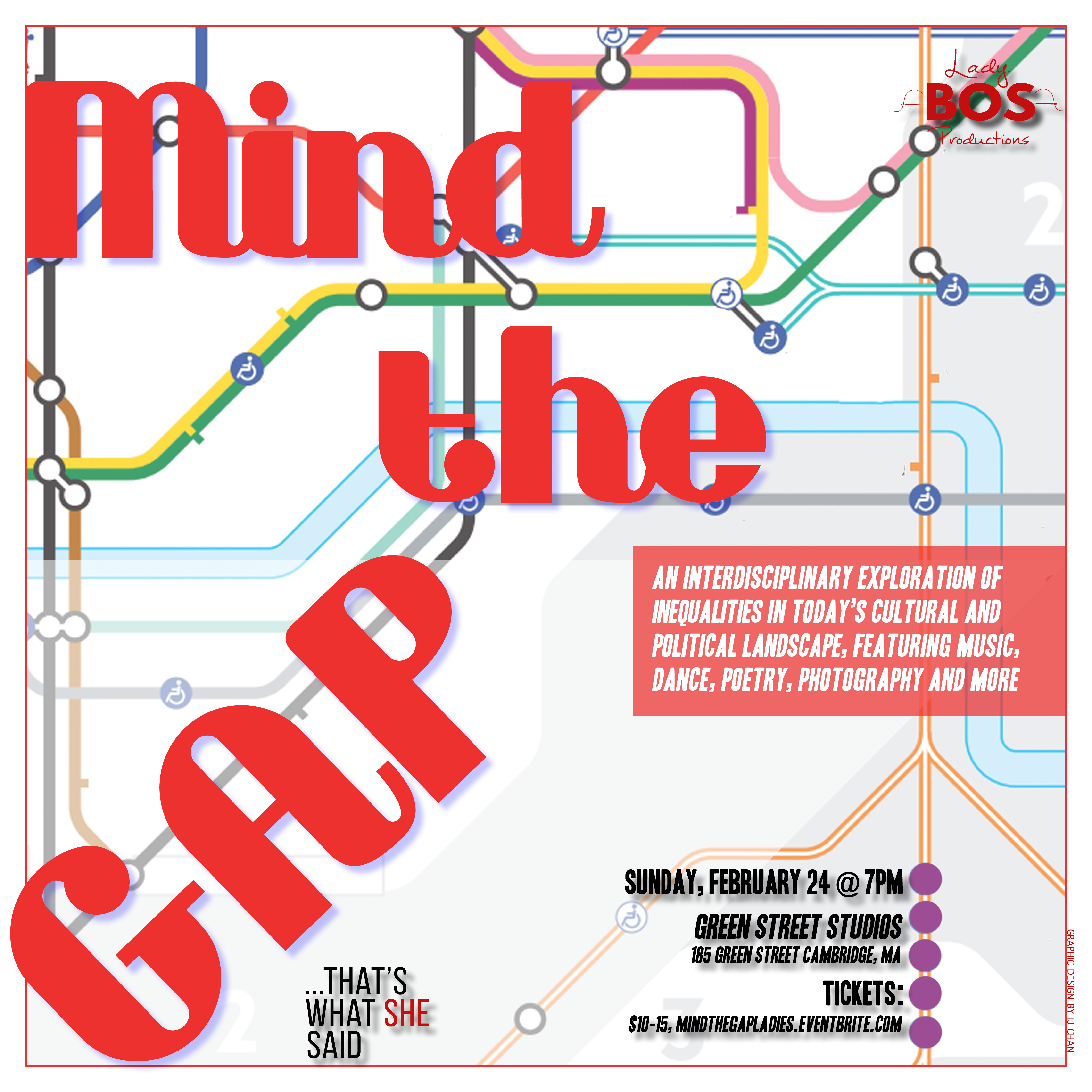 Lady BOS Productions presents MIND THE GAP, in association with “…that’s what she said.” Join us for an evening that explores the space between where we are and where we want to be. An interdisciplinary bill of visual and performance artists explore inequalities in today’s cultural and political landscape through music, dance, puppetry, poetry, and photography. Audiences are invited to explore the displays of art at their own pace; performances will rotate and repeat throughout the evening in two locations: Green Street Studios’ Studio 3 and the GSS Lounge. Drinks, light refreshments, and some locally made lady-art will be available for purchase as you navigate this inquisitive, investigative living gallery.