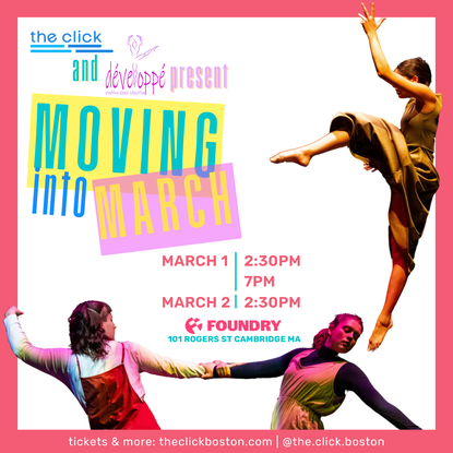 Moving Into March is an ongoing collaboration between The Click and développé Dance Studio that builds bridges and connections between pre-professional youth dancers, adult recreational dancers, and professionals. The show presents works created and performed by The Click, the students of développé, and The Click’s Community Contemporary Repertory students.