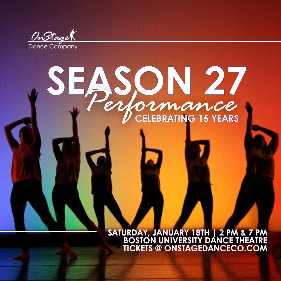 The Season 27 Performance features work in jazz, tap, contemporary, commercial, fusion, modern, and filmed pieces by OnStage company members Lexine Brooks, Emily Chang, Mykayla Cohen, Danielle Doody, Melissa deFriesse, Jennifer Kuhnberg, Sara Lodgen, Catherine Shortliffe, Austen Starr, Lizzy Thaman, Erica Thorp, Tyla Tognarelli, and Adi Wollny.