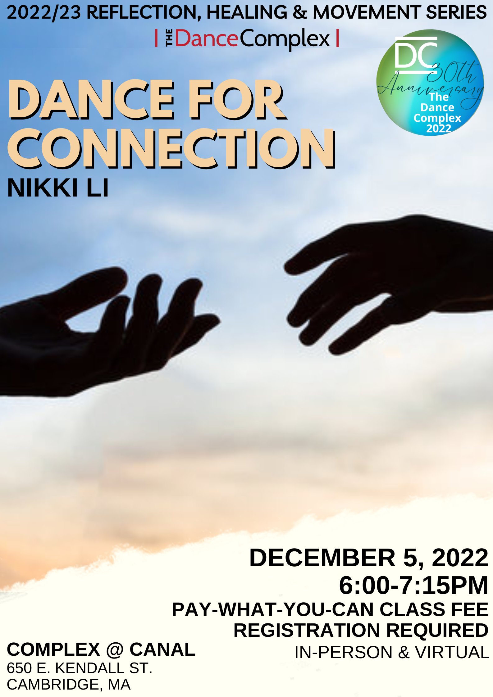 The Dance Complex presents its next Reflection, Healing, and Movement series event on December 5, 2022 with Nikki Li’s Dance for Connection. Nikki will lead this workshop with a focus on exploring physical connection and kinesthetic empathy through creative movement. This event is available virtually and in-person for a pay-what-you-can class fee. Masks are required … Continued