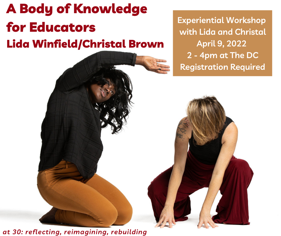 In this workshop Lida Winfield and Christal Brown will guide participants through an experiential investigation of identity through movement, writing and reflection. The goals of this hands-on workshop will include assessing bias and intercultural histories as well as practical tools for kinesthetic classroom engagement.