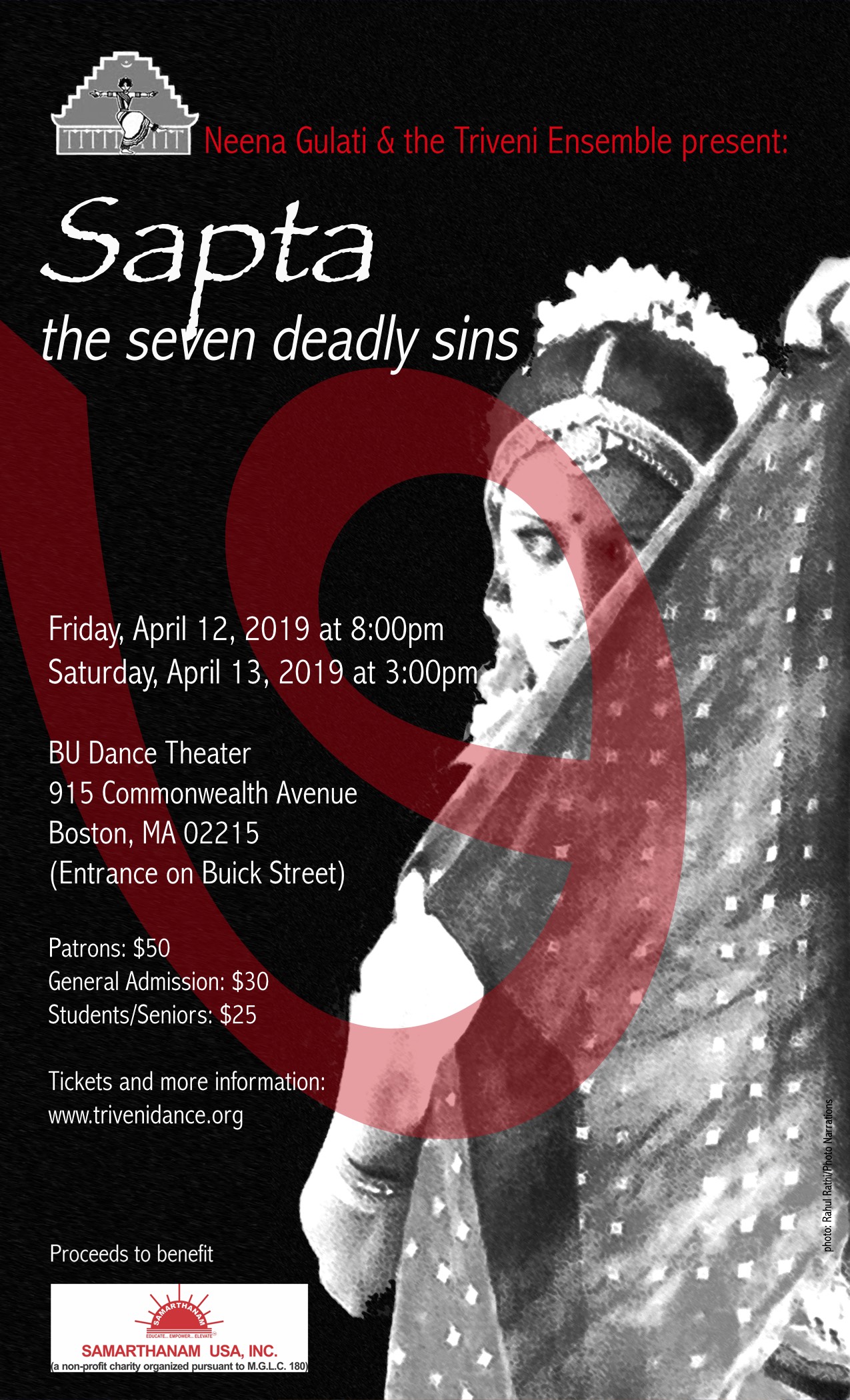 Neena Gulati and the Triveni Dance Ensemble present “Sapta – The Seven Deadly Sins” interpreting Indian classical dance in a modern context. All proceeds will support Samarthanam.
