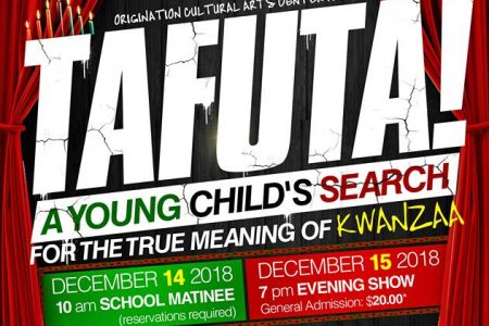 Tafuta! A Young Child’s Search for the True Meaning of Kwanzaa blends music, dance, and poetry to tell the story of a young child who is bullied in school because of her family’s tradition of celebrating Kwanzaa. The child ultimately embraces her heritage, discovers her own voice and self-empowerment and draws on the strength found in this African American tradition to triumph over the bullies. Tafuta is the only play of its kind and is surely going to make audiences understand the importance of family and traditions. The cast includes children ages 7-16 from all over Massachusetts including students from private, public and charter schools. This is a wonderful event for the entire family!