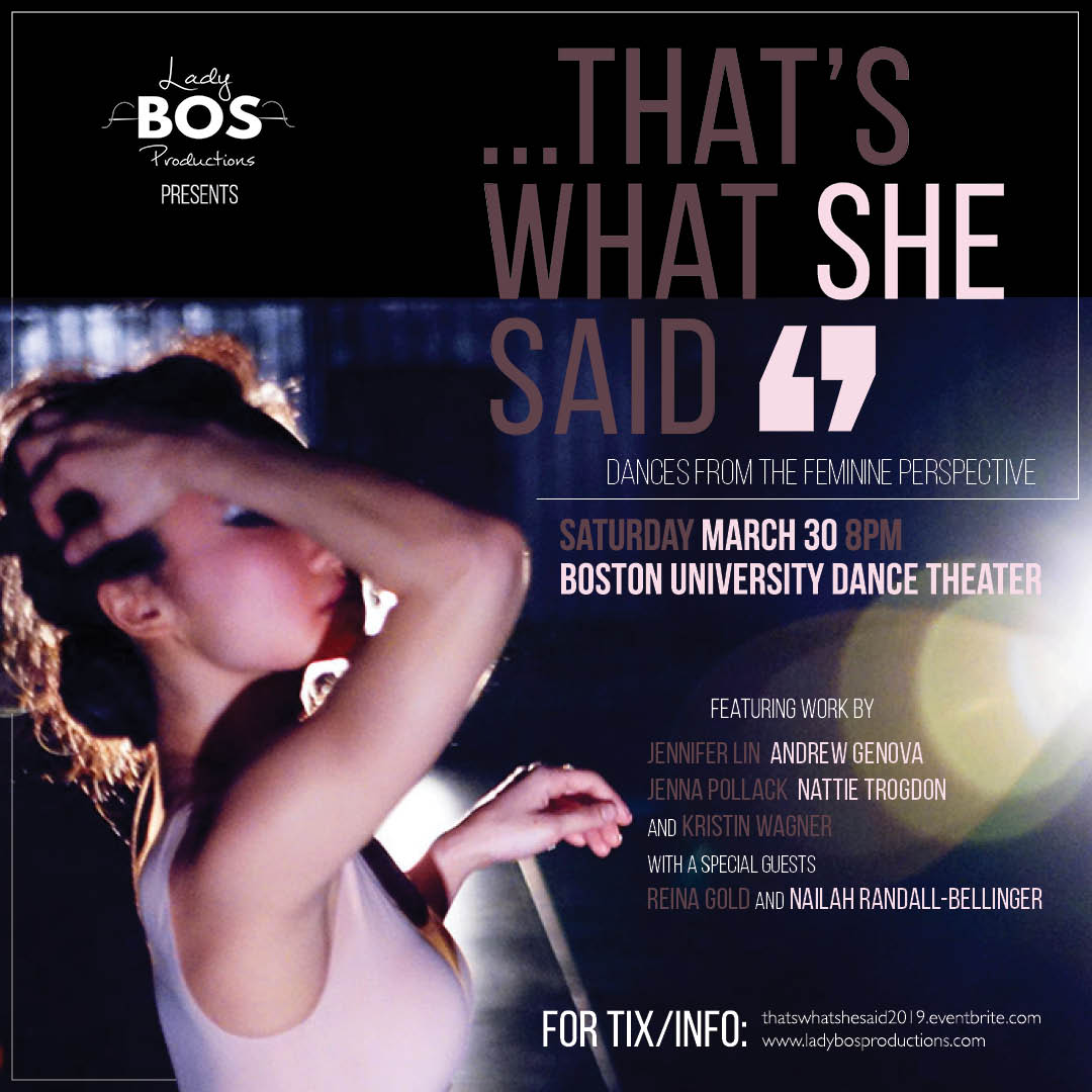Lady BOS Productions presents “…that’s what she said,” an evening of dances from the feminine perspective. For decades, we have found ourselves at a crossroads for gender equality. Today, social media has enabled long-standing gender discussions to sweep across the country with new force via movements such as #metoo, #timesup, and #askhermore. Yet all the while there remains a firm wall of fear and resistance that threatens our ability to progress, to understand, and to come together. Now is the time to shed an inner light on shared experiences. With “…that’s what she said,” Lady BOS Productions has invited femme dance artists to mine their personal narratives, histories, and lineages, and to physicalize their experience.