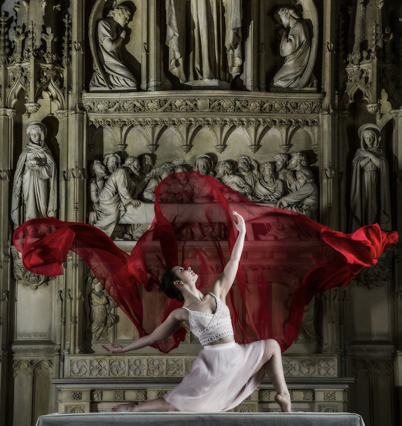 Dancer on one knee opens arms to sides and looks over left shoulder while red fabric floats in the background.
