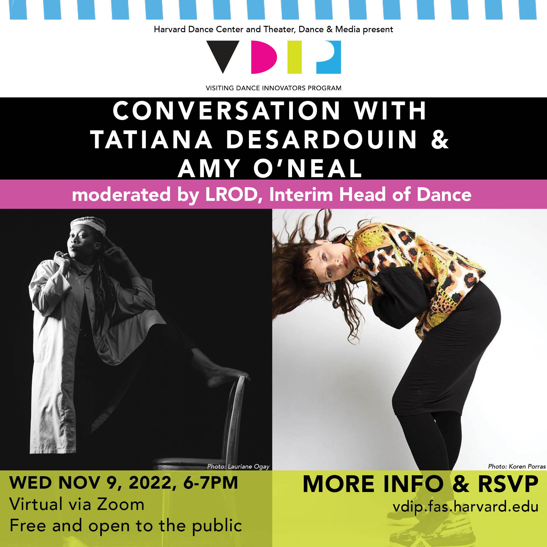 Join us for a virtual conversation with Fall 2022 VDIP artists Tatiana Desardouin and Amy O’Neal, moderated by LROD, Interim Head of Dance and Lecturer for Theater, Dance & Media!