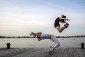 Two dancers by a waterfront on a pier: one in a black romper jumps and reaches arms and legs back, arching her back as the other, wearing a white shirt and pants hinges back over the tops of her feet and reaches arms over head.