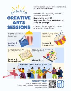 Summer Creative Arts Sessions poster with graphic design illustrations of activities that will be performed each day.