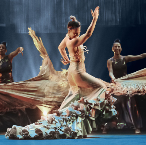 Still from Bailaora with Siudy Garrido dancing lifting one arm up and preparing to stomp one foot on the floor