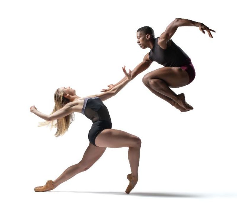 Two BalletX dancers: one on pointe with long blonde hair lunges over right leg and reaches arm towards the other dancer who jumps with both legs bent towards chest, reaching downward at blonde dancer and rounding other arm behind upperbody.