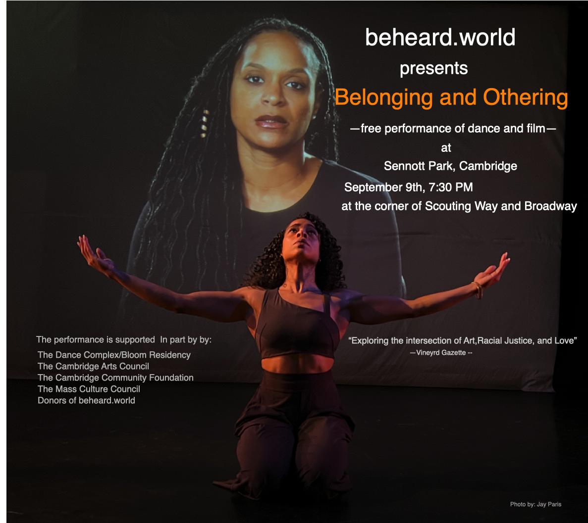 Photo of performance with projection of a female presenting person while another female presenting dancer kneels in front of the projection with arms rounded upwards. Event information on the upper right and lower left corners.