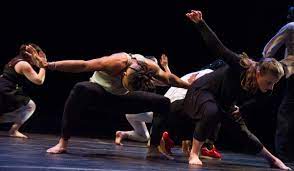 Beheard.world company dancers in a dark stage in deep lunges and squats.