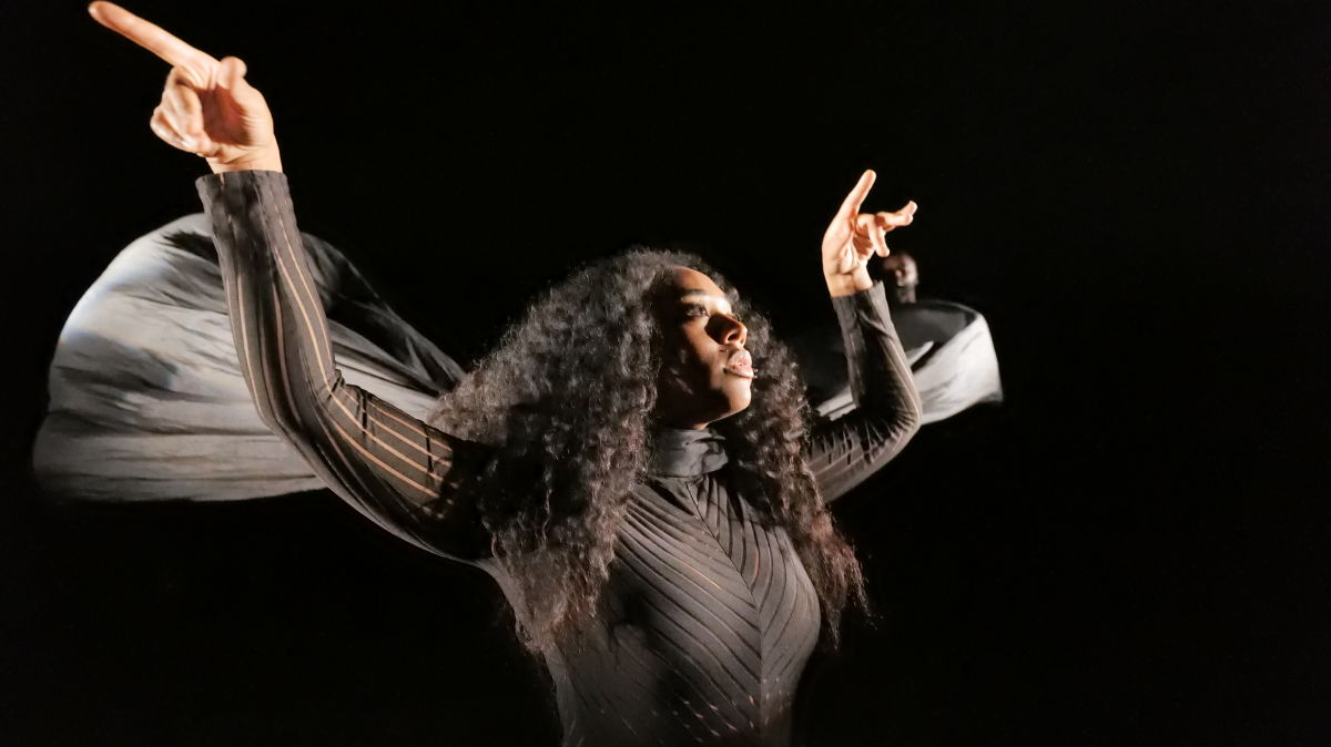 Black woman in dark clothes with fabric that looks like wings holds her arms up at an angle as if flying