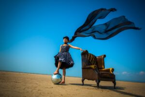 Chiara D'Anna in a polka dot dress and scarf blowing in the wind, standing in a dessert-like space holding on to a brown arm chair and placiing one foot over a metalic reflective sphere.