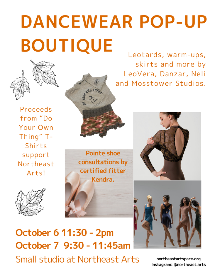 Dancewear pop-up poster with event information and photos of some of the products that will be available such as leotards and shorts.