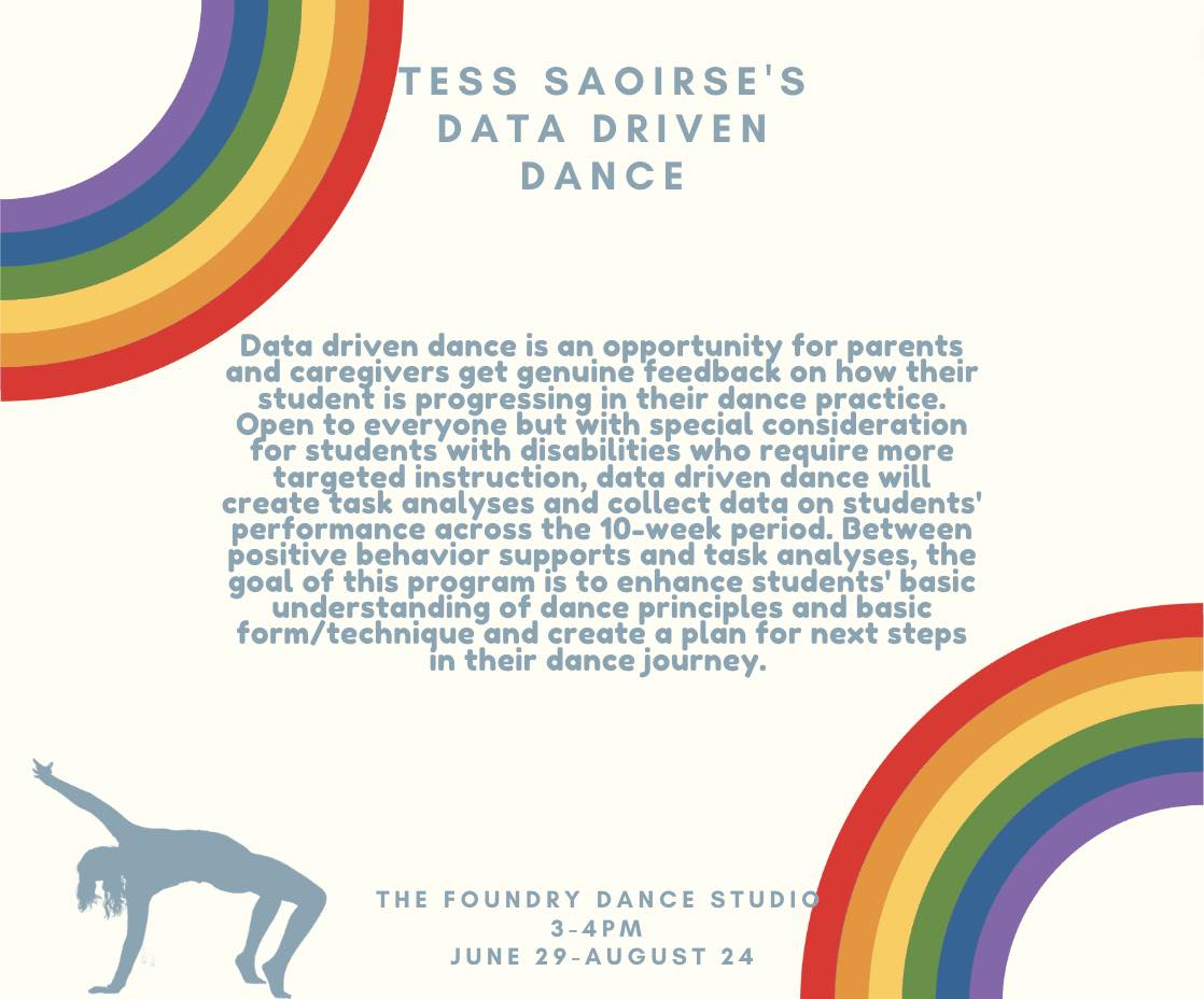 Data Driven Dance poster with cream background, rainbows on the lower right and upper left corners and a silhouetted illustration of a dancer in a back bend reaching one arm up.