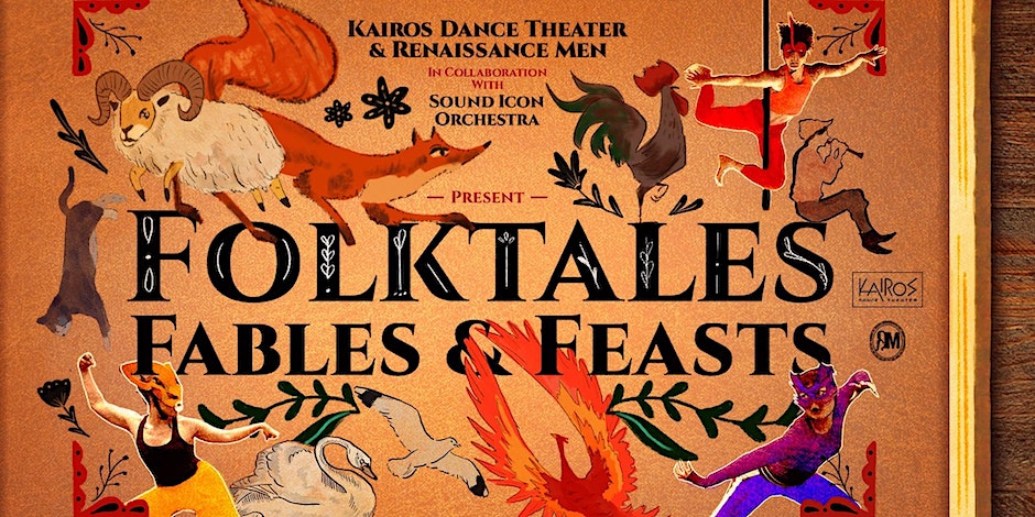 Folktales Fables and Feasts poster with multiple illustrations of each character in the stories: a fox, a ram, a rooster, a cat, a swan, a seagull, a phoenix, and photos of the performers as the ram, rooster and cat.