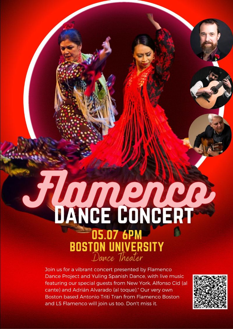 Flamenco dance concert poster with mostly red and some artists' photos.