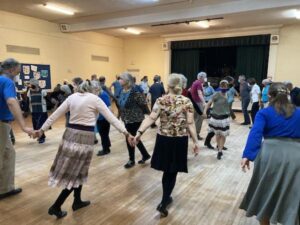 Multiple people in a large ballroom dancing holding hands in a large circle shape.