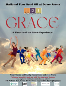 Grace poster with ice skaters in colorful costumes in different poses seem to glide over the sky image used as a background.