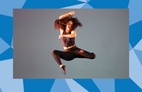 Dancer in black leggings and black cropped top jumps with both legs bent and staggered with one arm bend over head and the other bent in front of chest with long hair swishing to the sides.
