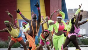 Multiple dancers outdoors wearing bright neon clothing reaching in multiple different directions.