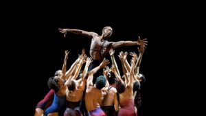 Photo of Complexions dancers clumped together lifting one of the dancers with wide spread arms.