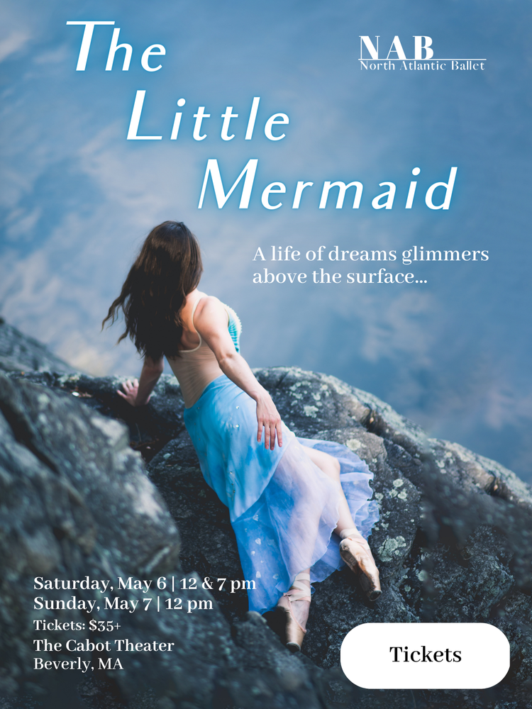A mermaid ballerina looks away into the distance as she sits on a rock.