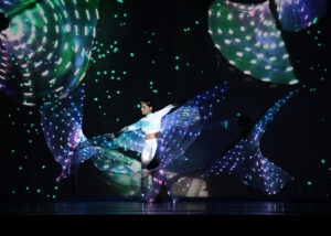 Photo of performer in white costume dancing with lights strung together on a long fabric and sticks.