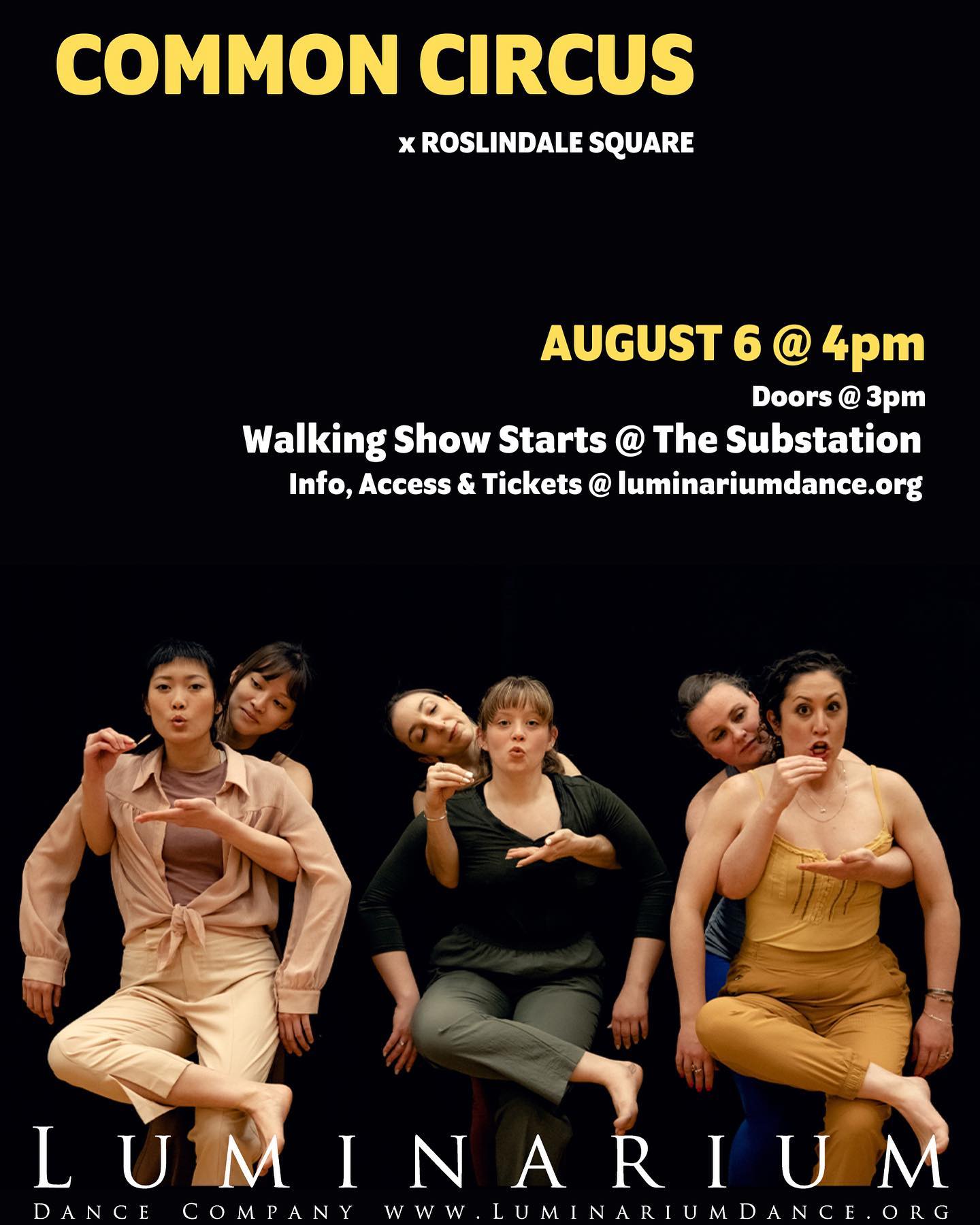 Common Circus poster with photo of 6 dancers paired up so that the front dancer looks like they are sitting with legs crossed and the dancer behind them serves them something imaginary to sip on.